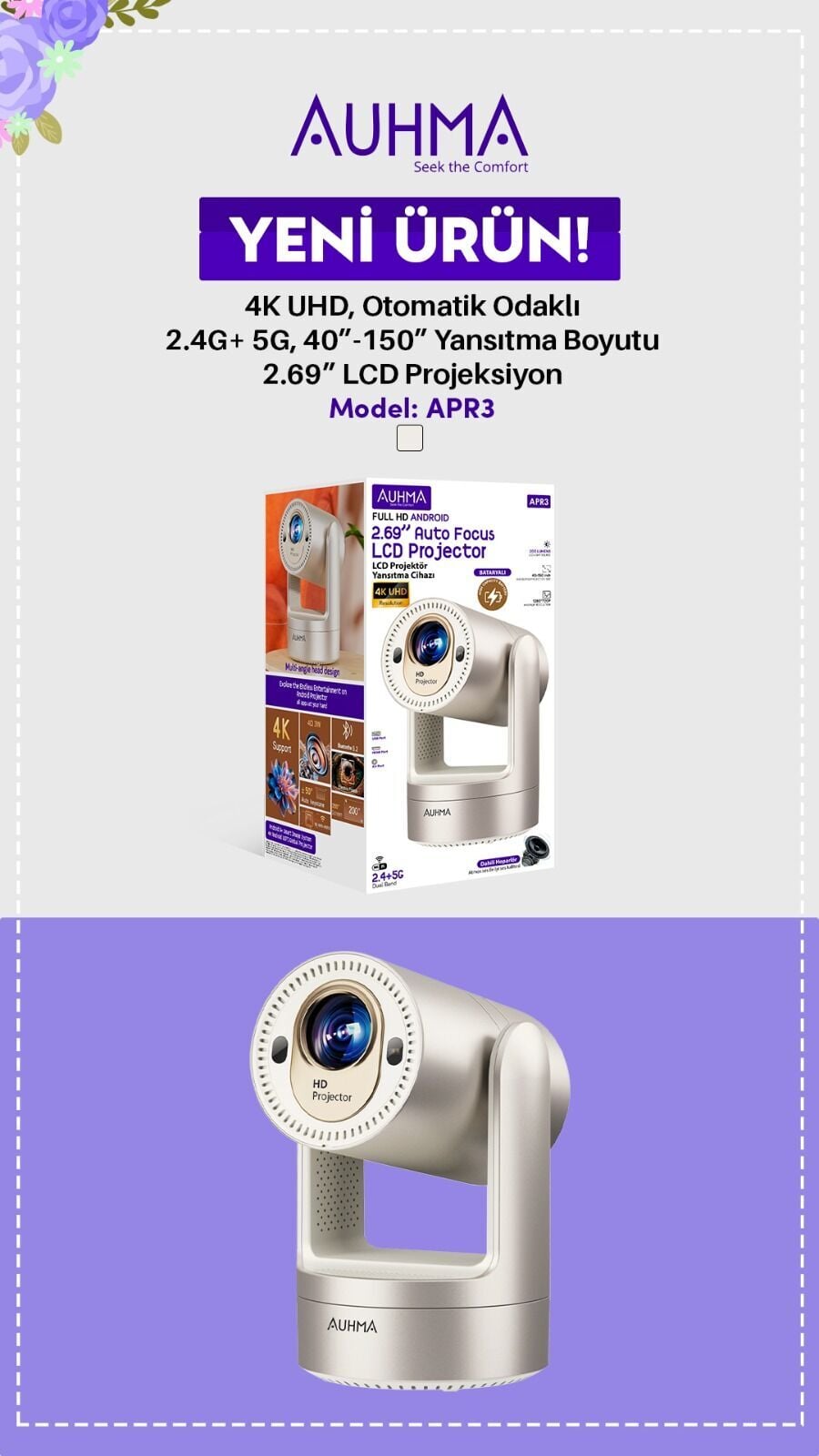 Yapay zeka destekli Auto-Focus (Otomatik Odaklama) teknolojisi ile bulanık görüntülere veda edin! Cihazı açtığınızda veya yerini değiştirdiğinizde saniyeler içinde görüntüyü otomatik olarak netleştirir. Auhma APR3 4K UHD Android Auto-Focus Projeksiyon (Bataryalı) Android işletim sistemi sayesinde telefon veya bilgisayara ihtiyaç duymadan; Netflix, YouTube, Disney+ gibi uygulamaları doğrudan cihaz üzerinden çalıştırabilirsiniz. 4K UHD video desteği, canlı renkleri ve güçlü ses sistemiyle Auhma APR3 4K UHD Android Auto-Focus Projeksiyon, sadece bir projeksiyon değil, çantanıza sığan dev bir eğlence merkezidir. Auhma APR3 4K UHD Android Auto-Focus Projeksiyon (Bataryalı)