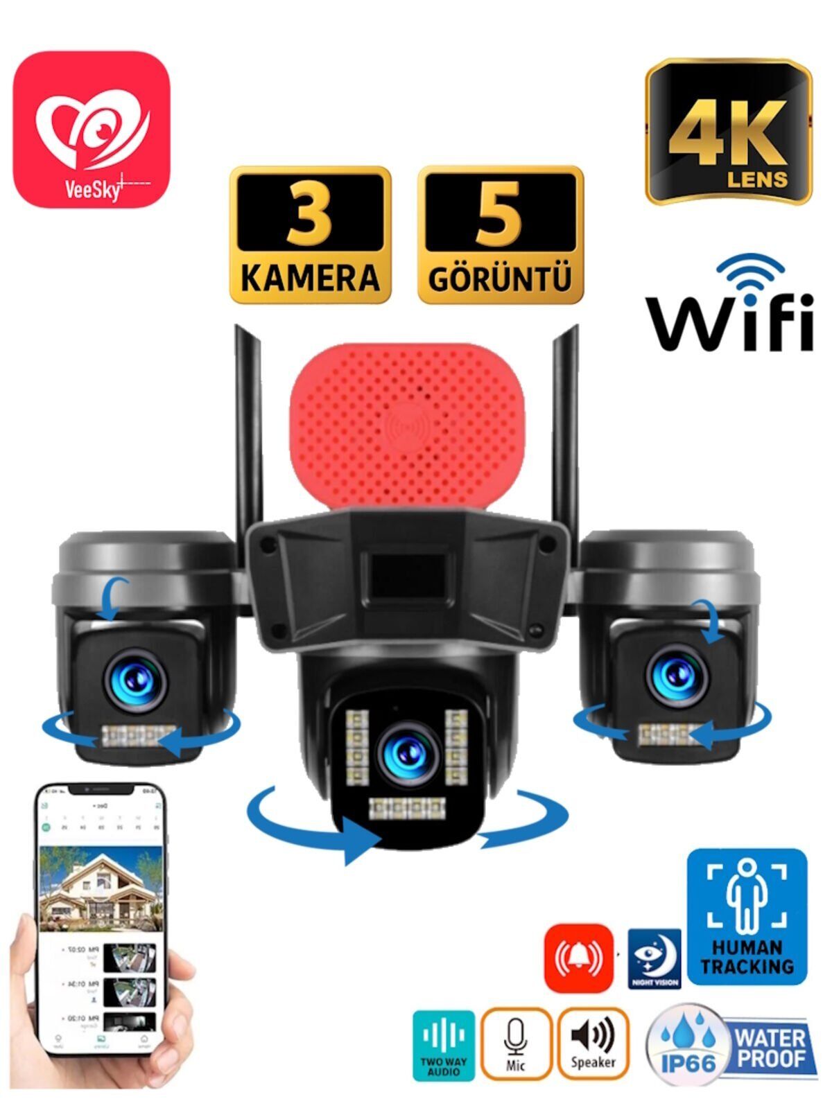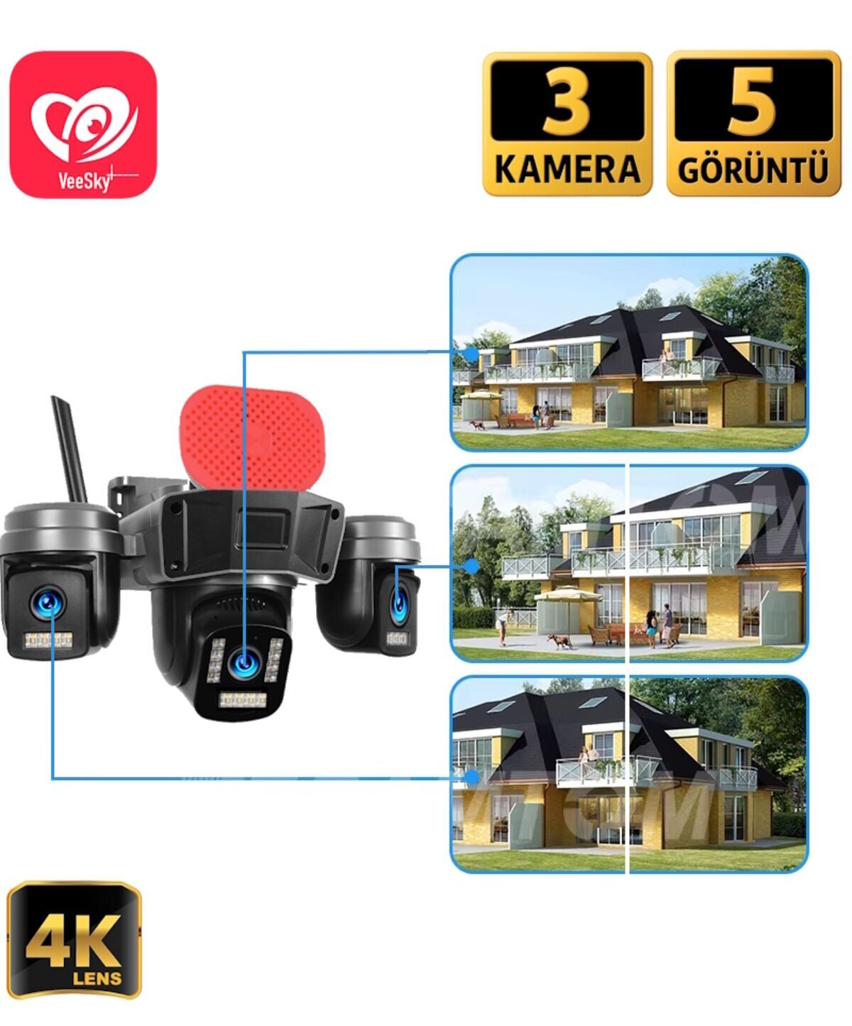 3 ayrı kamera lensi içerdiği belirtilmiş, tek ürünle üç görüntü açısı sağlanabiliyor.