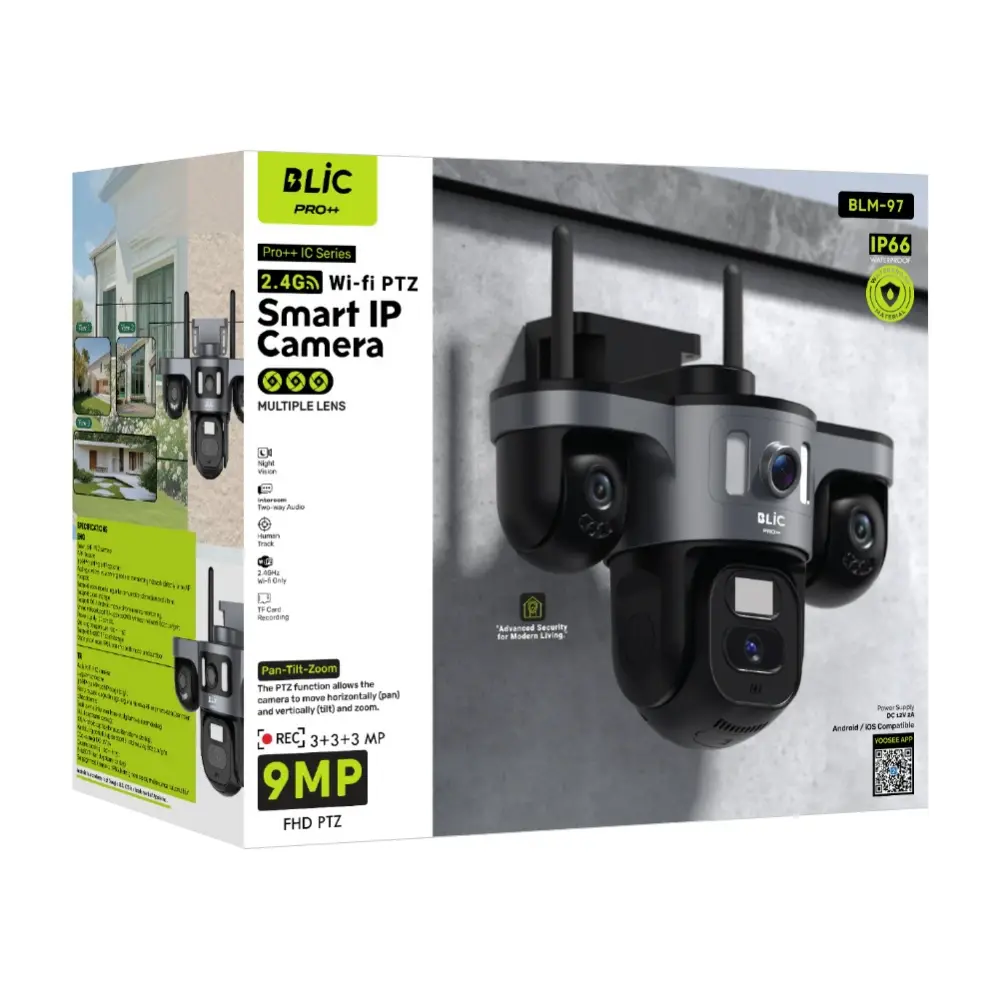 Güvenlikte sınırları zorlayan Blic Blm-97, hem ev hem de iş yeri güvenliği için tasarlanmış en gelişmiş kablosuz kamera çözümlerinden biridir. 9MP 4K çözünürlüğü ve devrim niteliğindeki 3 lensli 3 görüntülü yapısı sayesinde bu kablosuz kamera, mülkünüzün her köşesini kör nokta bırakmadan izler. Kulis Bilişim Teknoloji olarak Gaziantep merkezli 18 yıllık tecrübemizle sunduğumuz bu profesyonel kablosuz kamera, Yoosee uygulaması üzerinden tüm dünyadan anlık erişim imkanı sağlar.