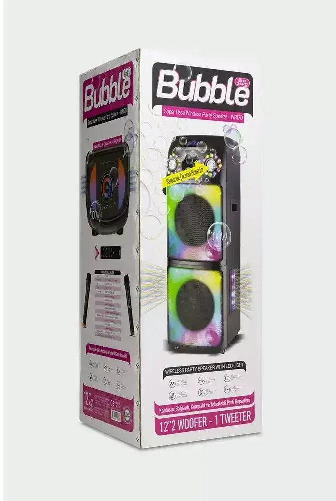 Subzero WR170 12"x2 100W 2 Kablosuz Mikrofonlu Kumandalı Baloncuk Çıkartan RGB Bluetooth/Usb/Sd Müzik Kutusu