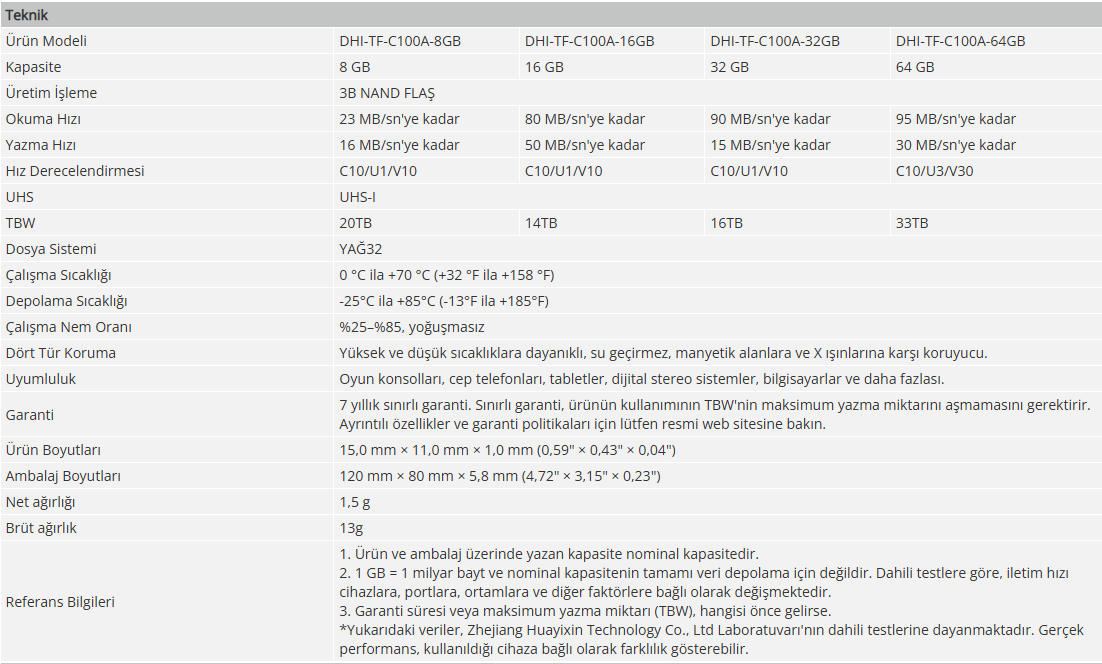 Özellik Detay Marka / Model Dahua C100A Serisi Kapasite 32 GB Kart Tipi MicroSDHC / MicroSDXC Hız Sınıfı Class 10, U3, V30 Maksimum Okuma Hızı 95 MB/s - 100 MB/s’ye kadar Maksimum Yazma Hızı 30 MB/s - 40 MB/s (Cihaza göre değişebilir) Flash Teknolojisi 3D TLC NAND Dosya Sistemi FAT32 / exFAT Çalışma Sıcaklığı 0°C ile +70°C arası Depolama Sıcaklığı -25°C ile +85°C arası Dayanıklılık Su geçirmez, Darbeye dayanıklı, X-Ray korumalı Kullanım Alanları Drone, Aksiyon Kamerası, Güvenlik Kamerası, Telefon