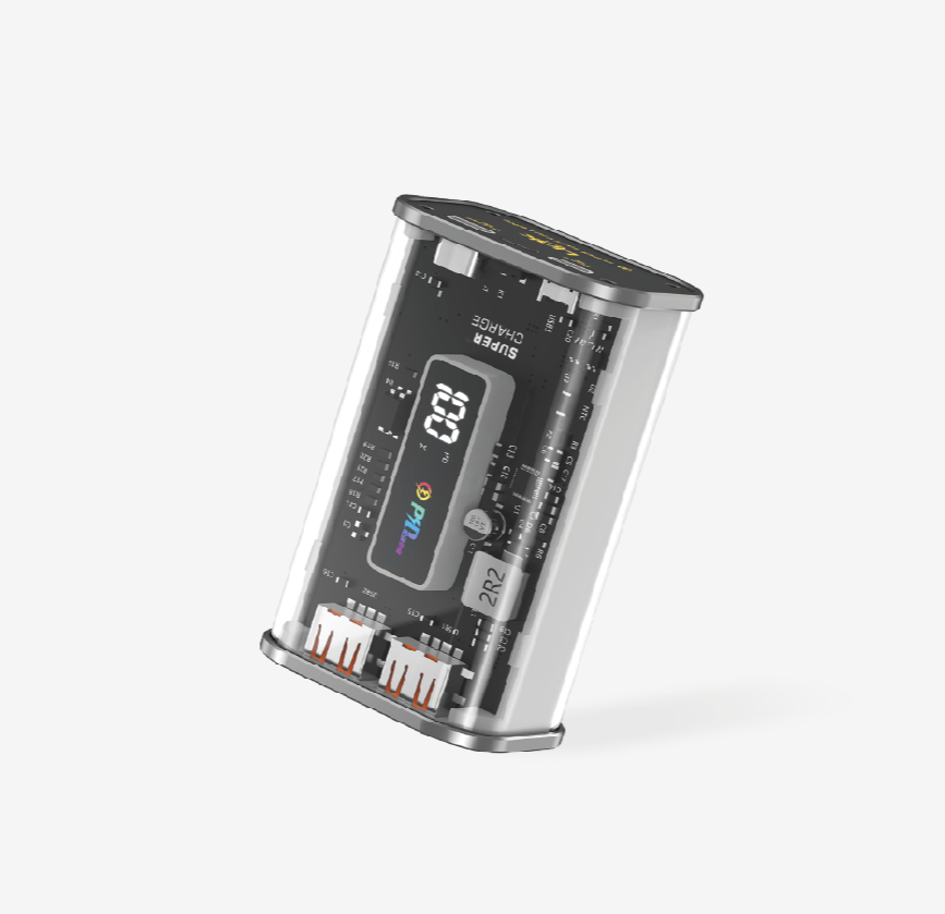 Benzersiz şeffaf tasarıma sahip kompakt bir powerbank, nefes alma efektli göz kamaştırıcı RGB, 10000mAh dahili Lityum pil, pil şarj yüzdesini gösteren dijital ekran, 1 Mikro USB giriş portu, 2 USB-A çıkış portu ve giriş/çıkış portu olarak kullanılabilen 1 Tip-C.