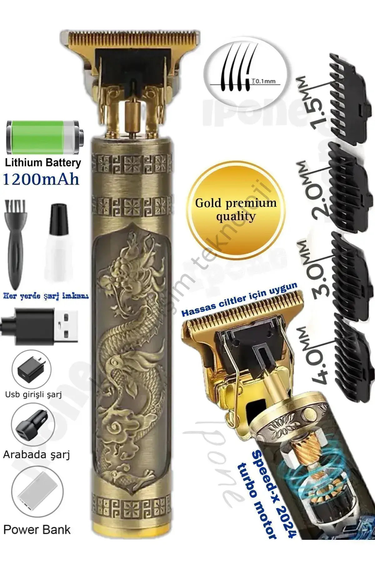 - Teknik Özellikler: •Bıçak Türü: Çelik bıçaklar •Şarj Süresi: 2 saat •Kullanım Süresi: 60 dakika •Şarj Türü: USB bağlantılı (Bilgisayar, powerbank, USB adaptör, araba şarjı ile uyumlu) •Tarak Boyutları: 1.5 mm, 2mm, 3mm, 4mm •Batarya Türü: Lityum batarya •Motor: Yüksek güçlü ve sessiz motor •Renk: Altın ve gümüş dragon işlemeli tasarım Bu güçlü ve şık tıraş makinesi ile kişisel bakımınızı en üst seviyeye taşıyın.